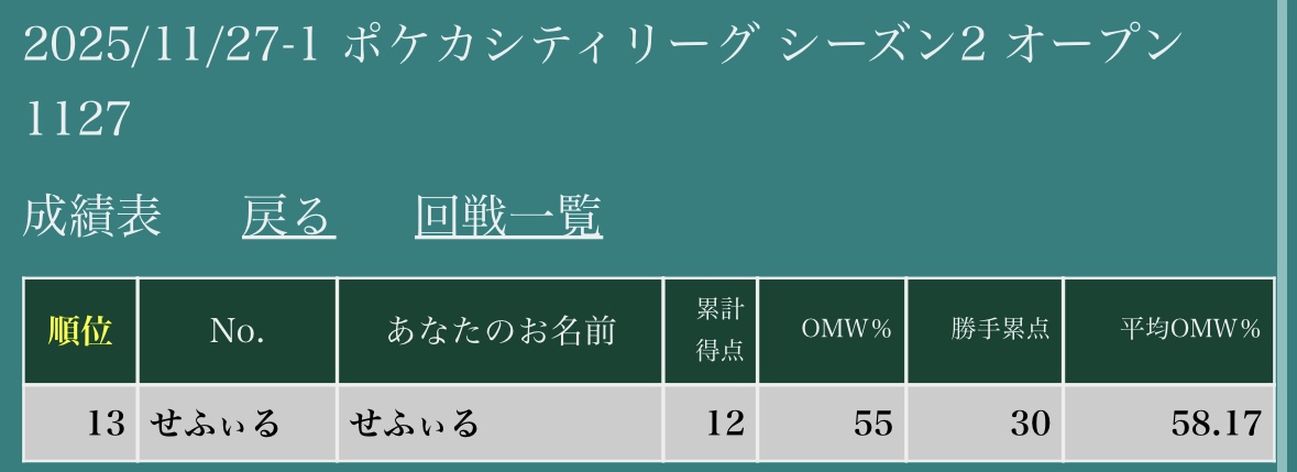 今回のシティリーグの最終戦績は、4勝2敗の最終13位という結果になりました。