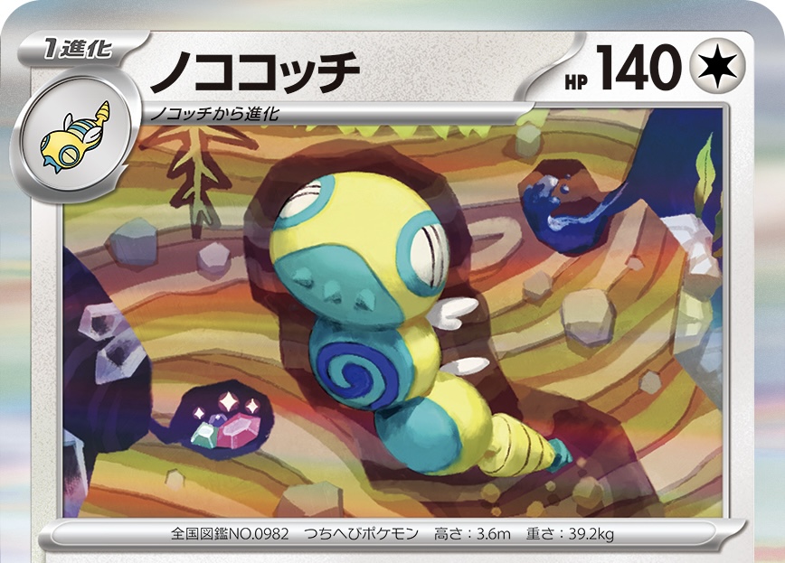 ノココッチは、無色タイプの1進化ポケモンで、ノコッチから進化できます。HPは140なので、ヨノワールのカースドボムでギリギリ倒されないため、個人的には評価が高いですね。